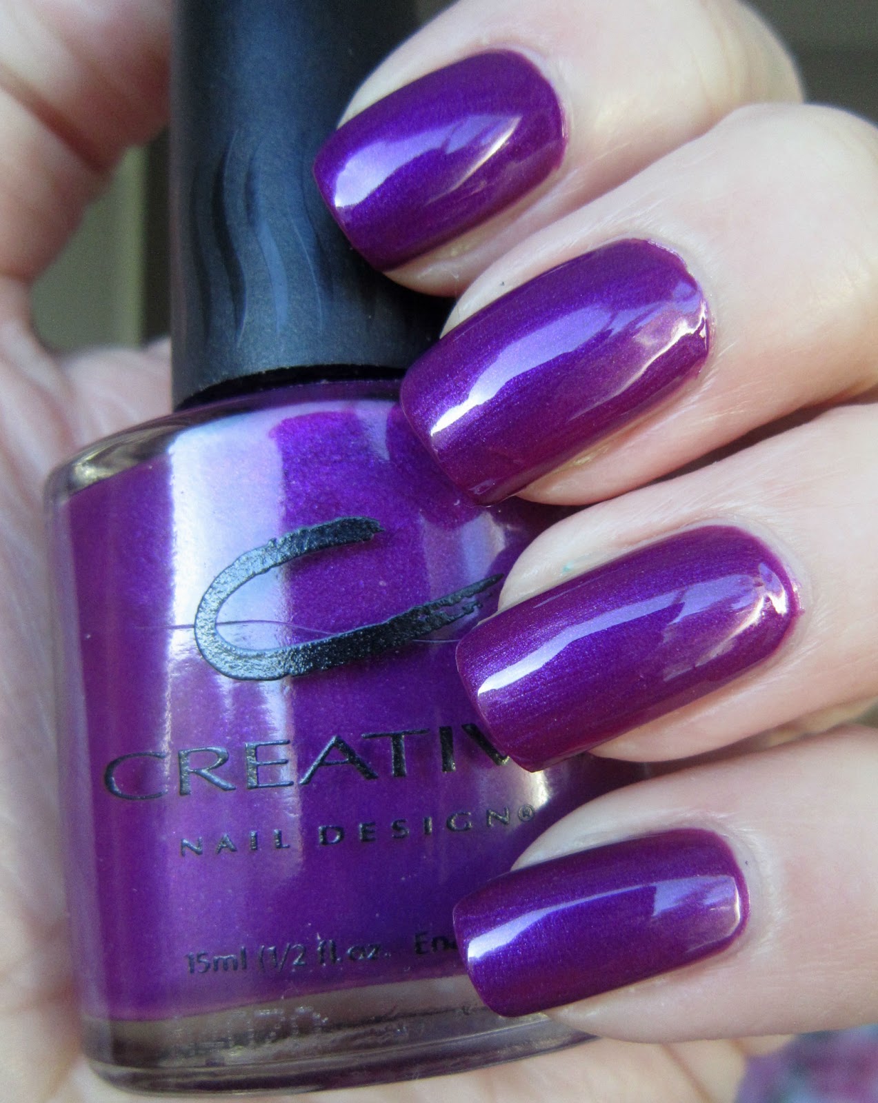 I've had Creative Heiress in my possession for a few years, but this is the first time I've tried it. It's been sitting amongst my untrieds - what a shame! It's a gorgeous red-toned purple with purple shimmer. I had some issues with the formula, it was thin and runny. Three coats gives you full coverage.